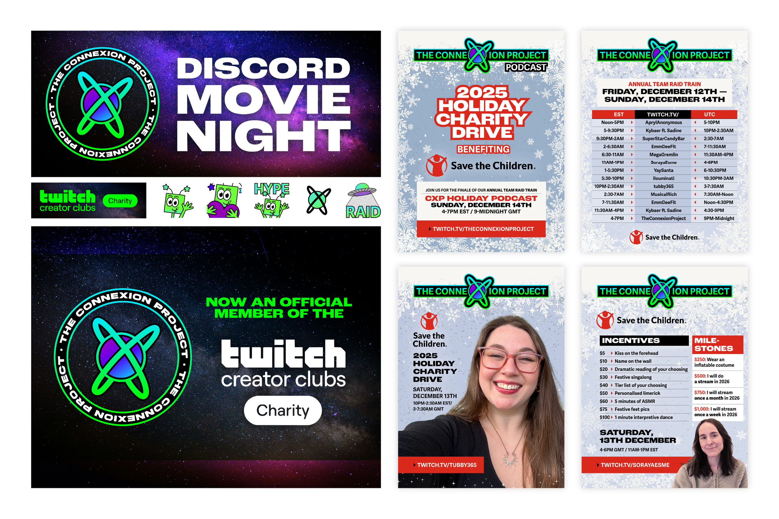 Select works developed for content creators, including logos, emotes, promotional graphics, banners, and badges.